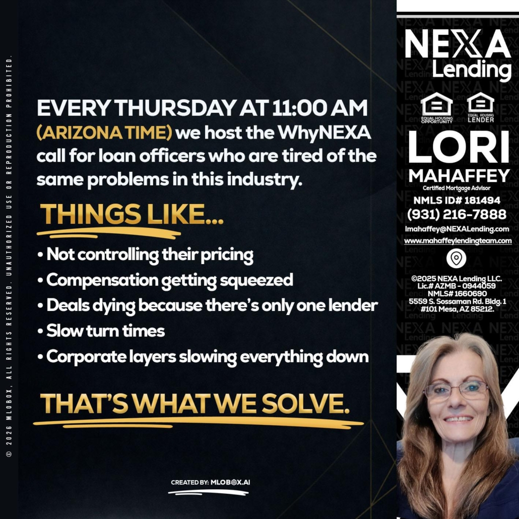 every Thursday - Lori Mahaffey -Senior Loan Officer, Certified Mortgage AdvisorHi, my name is Lori Mahaffey. I’m a Loan Officer with Lori Mahaffey LLC, offering personalized mortgage solutions, fast customized quotes, great rates and service with integrity.