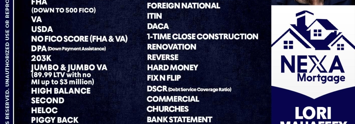 Hi, my name is Lori Mahaffey. I’m a Loan Officer with NEXA Mortgage LLC., offering personalized mortgage solutions, fast customized quotes, great rates and service with integrity.