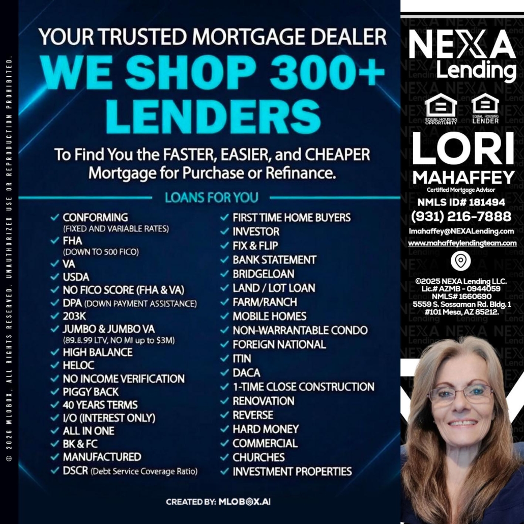 we shop 300 + lenders - Lori Mahaffey -Senior Loan Officer, Certified Mortgage AdvisorHi, my name is Lori Mahaffey. I’m a Loan Officer with Lori Mahaffey LLC, offering personalized mortgage solutions, fast customized quotes, great rates and service with integrity.